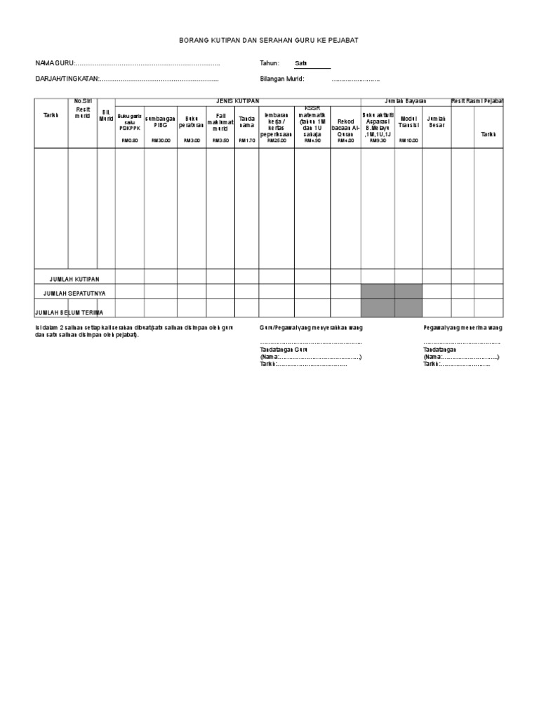 Bawa bersama beberapa dokumen penting seperti mykad termasuk salinan sijil kematian sekiranya ingin menyemak bagi si mati 3. Tarikh PenerimaanUrusniaga 43 MEREKOD PUNGUTAN a Pungutan yang dibuat oleh guru kelas hendaklah direkodkan ke dalam Borang Kutipan dan Serahan Guru Ke Pejabat dan diserahkan bersama-sama buku resit kepada PengetuaGuru Besar pada hari yang sama TPKPKWS 535 44 b Tindakan Guru Kelas. Tindakan Pejabat Pengurusan Sekolah terhadap serahan pungutan yuran - Menerima menyemak dan menyimpan Borang Kutipan Serahan Guru ke pejabat - Menyemak Buku Resit Murid seperti kenyataan Borang Serahan - Menyemak jumlah wang cek dan lain-lain - Mengeluarkan Resit Induk.